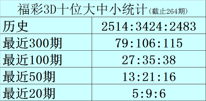 十位推荐:十位在前20期开奖中号码大中小比为5:9:6,当前大号遗漏1期,中号遗漏0期,小 号遗漏2期,另外号码0-9大中小分布遗漏期数分别为: