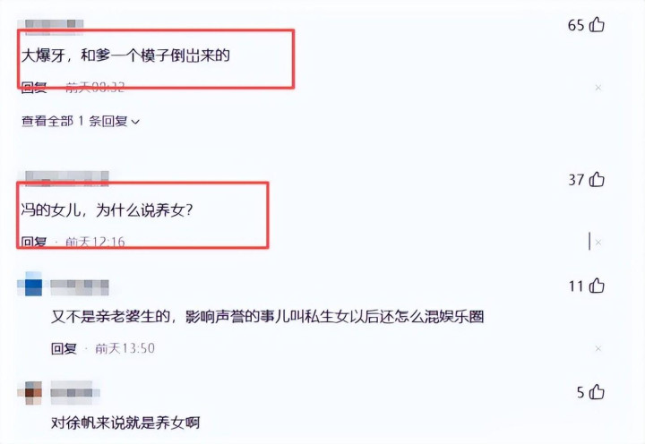 然而,徐帆回应离婚的传闻才过了两月就有了新的发展,更多人觉得徐朵和冯导长得越来越像了,外界传闻“就是冯导的女儿”。