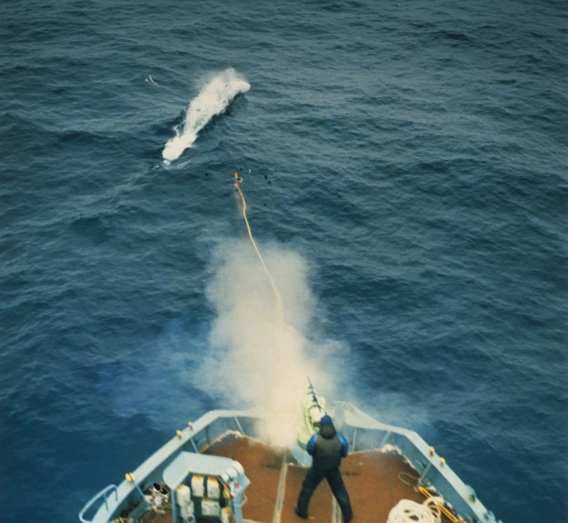 伴随着急促呼吸喷出的水雾,巨兽正在海面上仓皇沉浮,在它身后,追击的船队不断迫近。渔叉射中了它!除了难忍的剧痛,渔叉拖拽的浮漂让它难以游动。很快,一枚更重的渔叉嵌入身体,猛烈的爆炸之后,它的苦痛终于到了尽头……