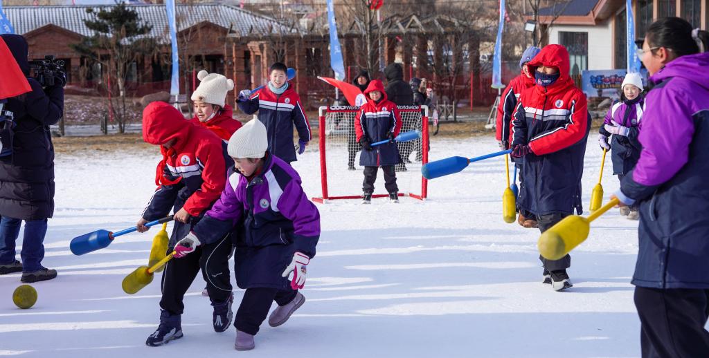 12月3日,吉林市第二实验小学学生在吉林市纳美山谷度假区体验雪上软式棒球。新华社记者 颜麟蕴 摄