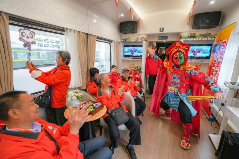 2025年3月28日,在Y471次“熊猫专列·什邡号”列车上,旅客观看川剧变脸表演。这是一辆60岁以上的游客占比达到68%的“银发专列”。新华社记者 王曦 摄