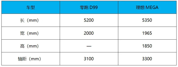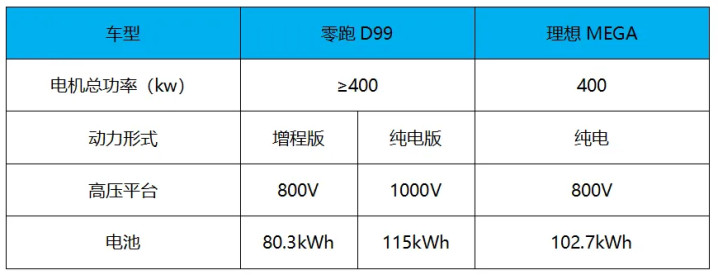 从动力续航来看,这两款车在总功率方面应该相差不大,而在动力形式上零跑D99的可选择性更多一些,而纯电版本零跑D99采用的是1000V平台,理想MEGA采用的是800V平台,电池方面,零跑D99用的是115kWh,理想MEGA用的是102.7kWh,这也代表前者的续航里程上会更有优势。